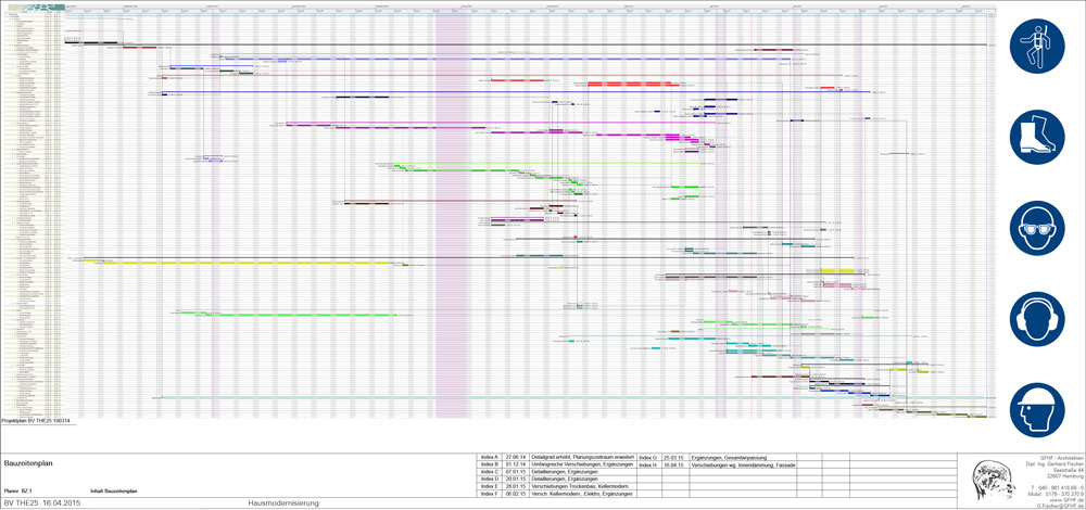 Vor Beginn der Arbeiten wird frühzeitig ein Bauzeitenplan erstellt, der es ermöglicht einen umfassenden Planungs- und Ausführungsablauf zu gewährleisten. Nach Eingang aller Rückläufer aus den vereschiedenen Ausschreibungen, erstellen wir die Preisspiegel und beraten zu der jeweiligen Beauftragung der Gewerke. Hier spielen der Preis, aber auch die wirtschaftliche Lage des beauftragten Unternehmens eine große Rolle. Die Zuverlässigkeit und die fachgerechte Umsetzung wird vor der Beauftragung natürlich auch geprüft.