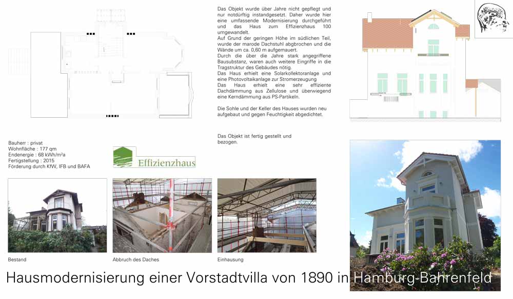 Durchführung von energetischen Berechnungen, um das Potenzial der Immobilie bestimmen zu können. Hierzu bieten sich der Hamburger Energiepass, gefördert von der Stadt Hamburg über die IFB (Investitions- und Förderbank Hamburg. Alternativ kann man für alle Gebäude auch eine Vor-Ort-Beratung durchführen, die bundesweit über das BAFA gefördert wird. Die Vor-Ort-Beratung liegt bei Einfamilienhäusern um 700,- Euro brutto als Eigenanteil. Der Hamburger Energiepass liegt bei rund 200,- Euro Eigenanteil, da die Stadt Hamburg hier stark fördert. Für weitere Details wenden Sie sich gern an uns.